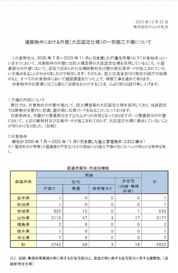 山形市の住宅メーカー、クリエイト礼文(れもん)は23年12月22日、山形や宮城など7県で2000~20年に引き渡した戸建て住宅など約2800棟について建築基準法違反があったと発表した。国への届け出と異なる方法で外壁工事をしていた。同社は試験結果をもとに安全性に問題はないとしているが、県内の建築物について指導・監督をする県は、早急に改修するように求めている。
