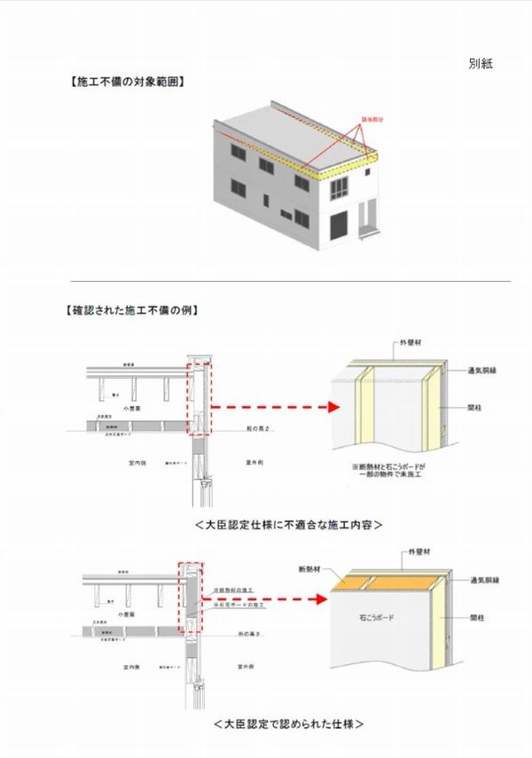 同社によると、違反が確認されたのは、山形2177棟、宮城633棟、埼玉7棟、福島2棟、岩手1棟、秋田1棟、栃木1棟の7県計2822棟。うち戸建て住宅は2742棟だった。建物の外壁に防火用の断熱材と石膏ボードを入れる施工方法で国から認定を受けていたが、一部の外壁に入っていないことが売り主からの指摘をきっかけに判明した。社内の指示などに不備があったという。9月以降、県を通じて国土交通省に違反を報告した上で、調査と改修工事を進めている。